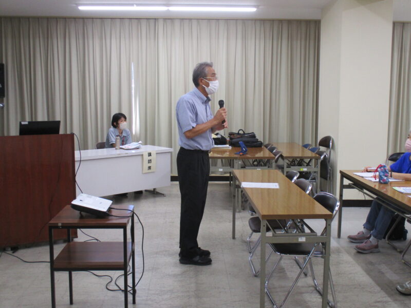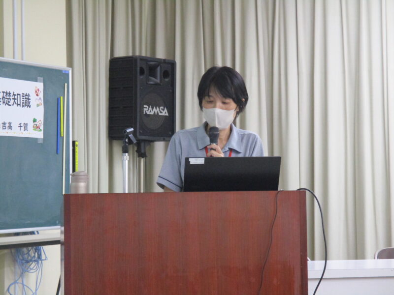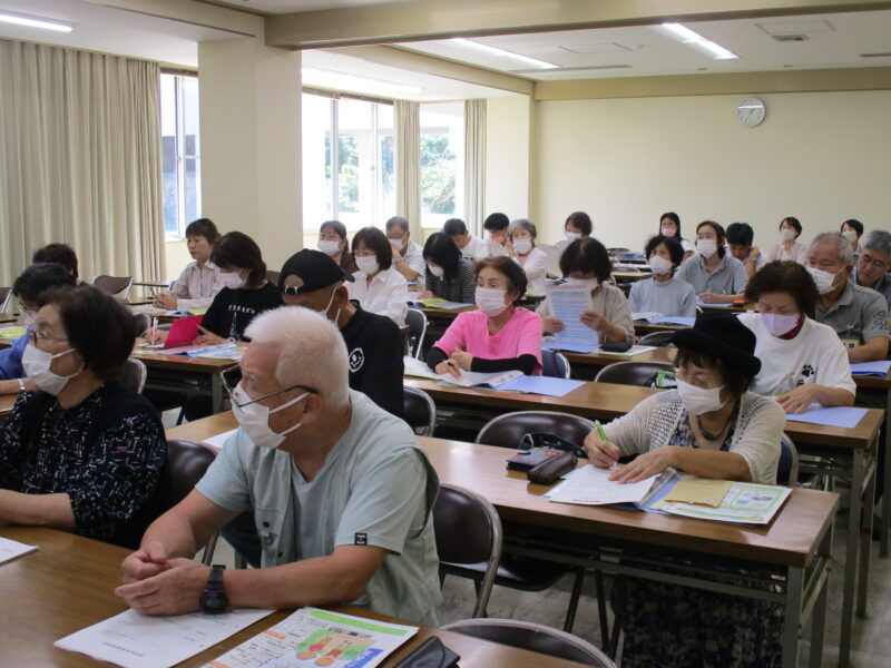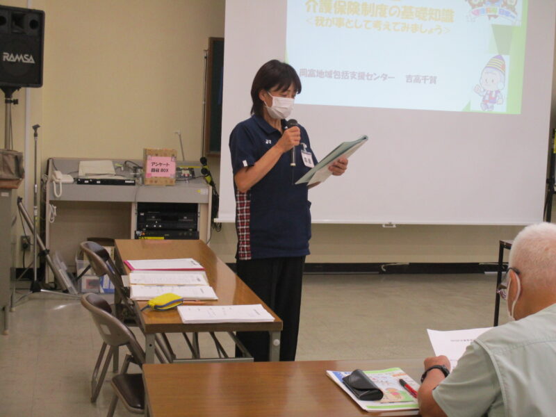 はじめに、当協会中村局長が、地域における介護予防の重要性や、本教室への期待について挨拶を行いました。引き続き、岡富地域包括支援センター 吉高所長より「介護保険制度について」の講義が行われ、介護保険の仕組みやサービスの種類、利用の流れなどを学びました。