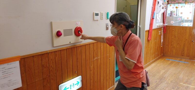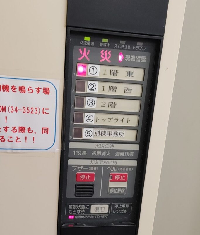 火災発生!火災報知器は、2階の児童館、隣の包括支援センターにも連動しています