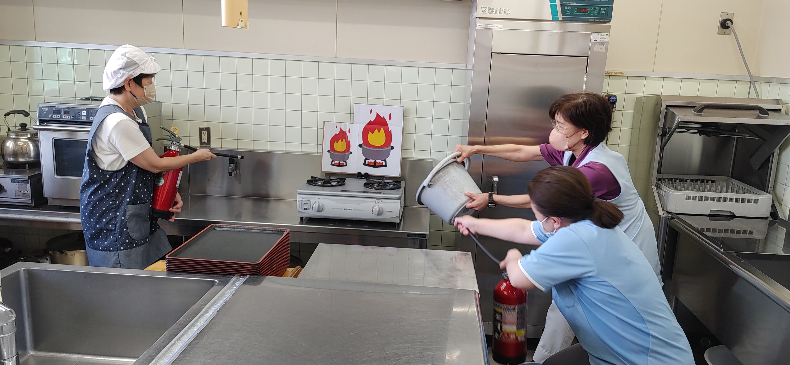 厨房では、消火器とバケツで消火対応