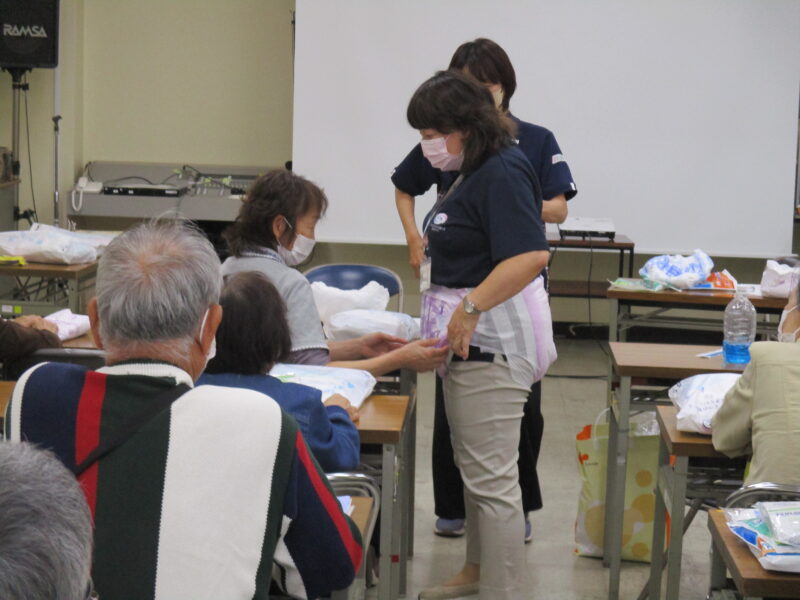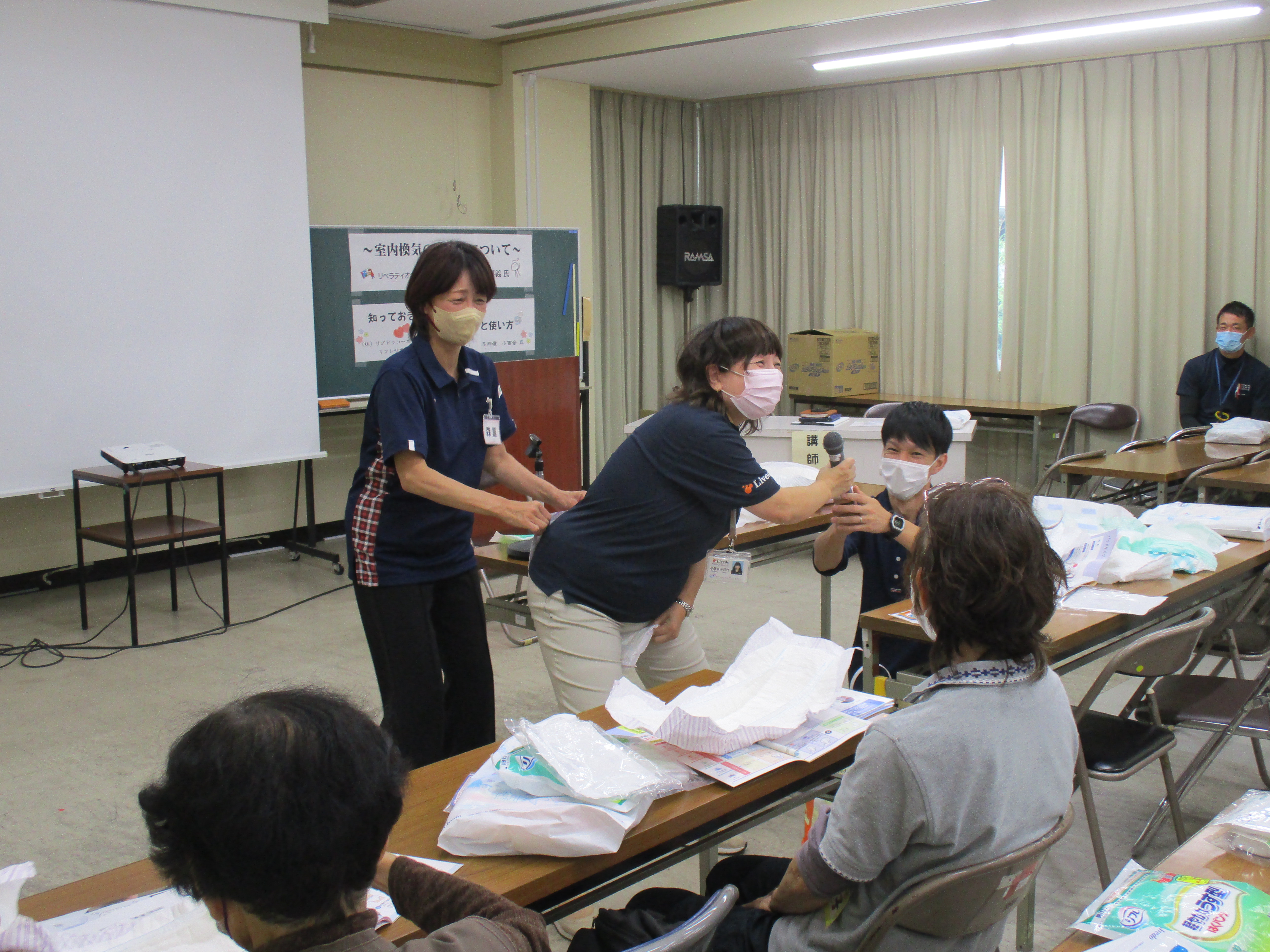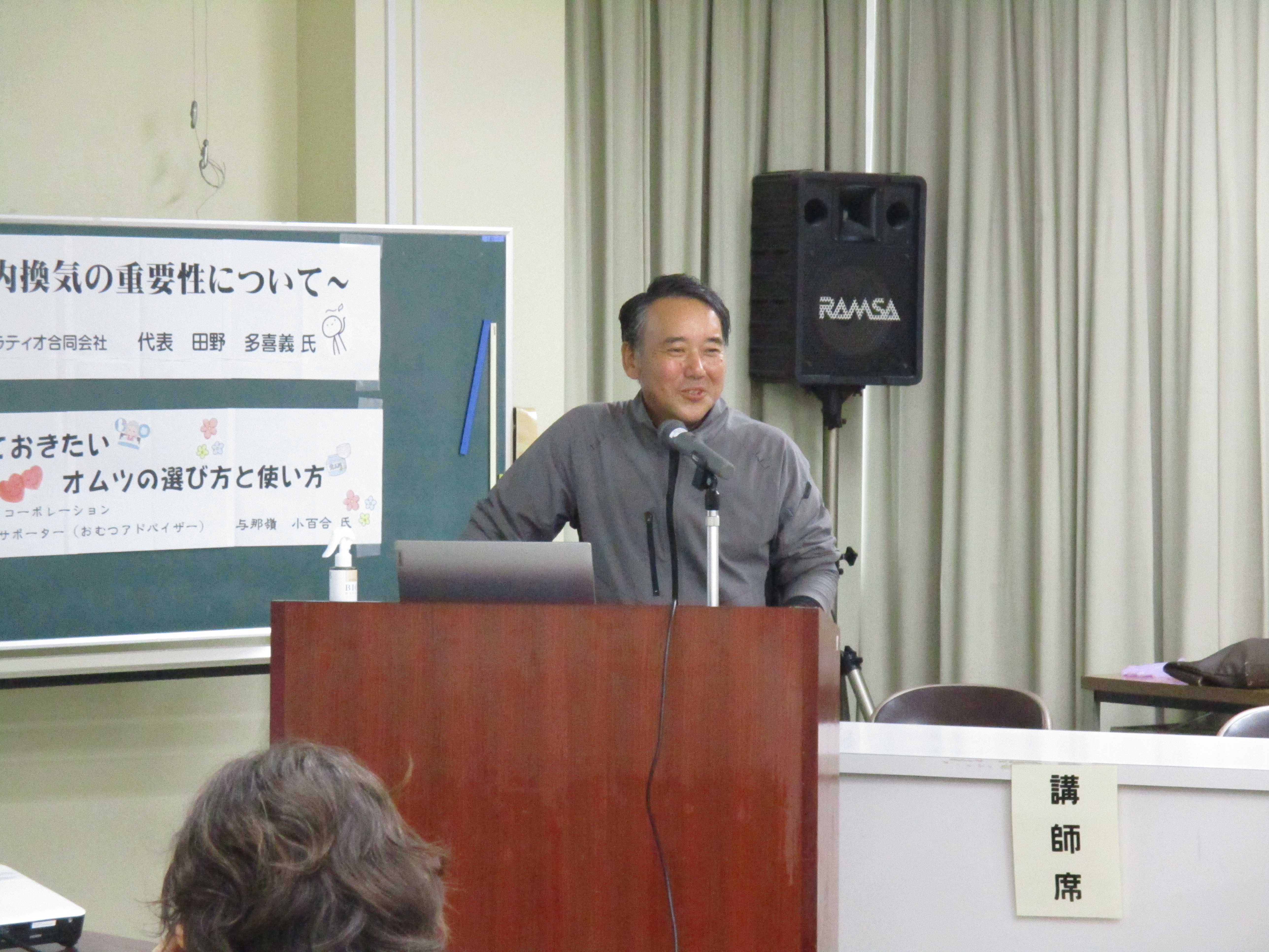 10月23日(木)に、 第2回目の介護教室が行われました。今回は2部制で行い、1部は「換気の重要性について」と題し、リベラティオ代表田野氏により、カビの一部が発する有害物質が脳に悪影響を与え、アルツハイマー型認知症を引き起こす可能性があることが紹介されました。生活環境の衛生管理が重要であることを学び、洗剤もアルカリ性の物と酸性のものを、用途に応じて使い分けることの必要性と上手な使い方を教えていただきました。質疑応答では、クーラーの室外機や換気扇の内部など、普段掃除しにくい箇所のお手入れ方法などをお聞きしました。