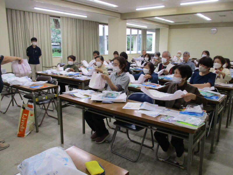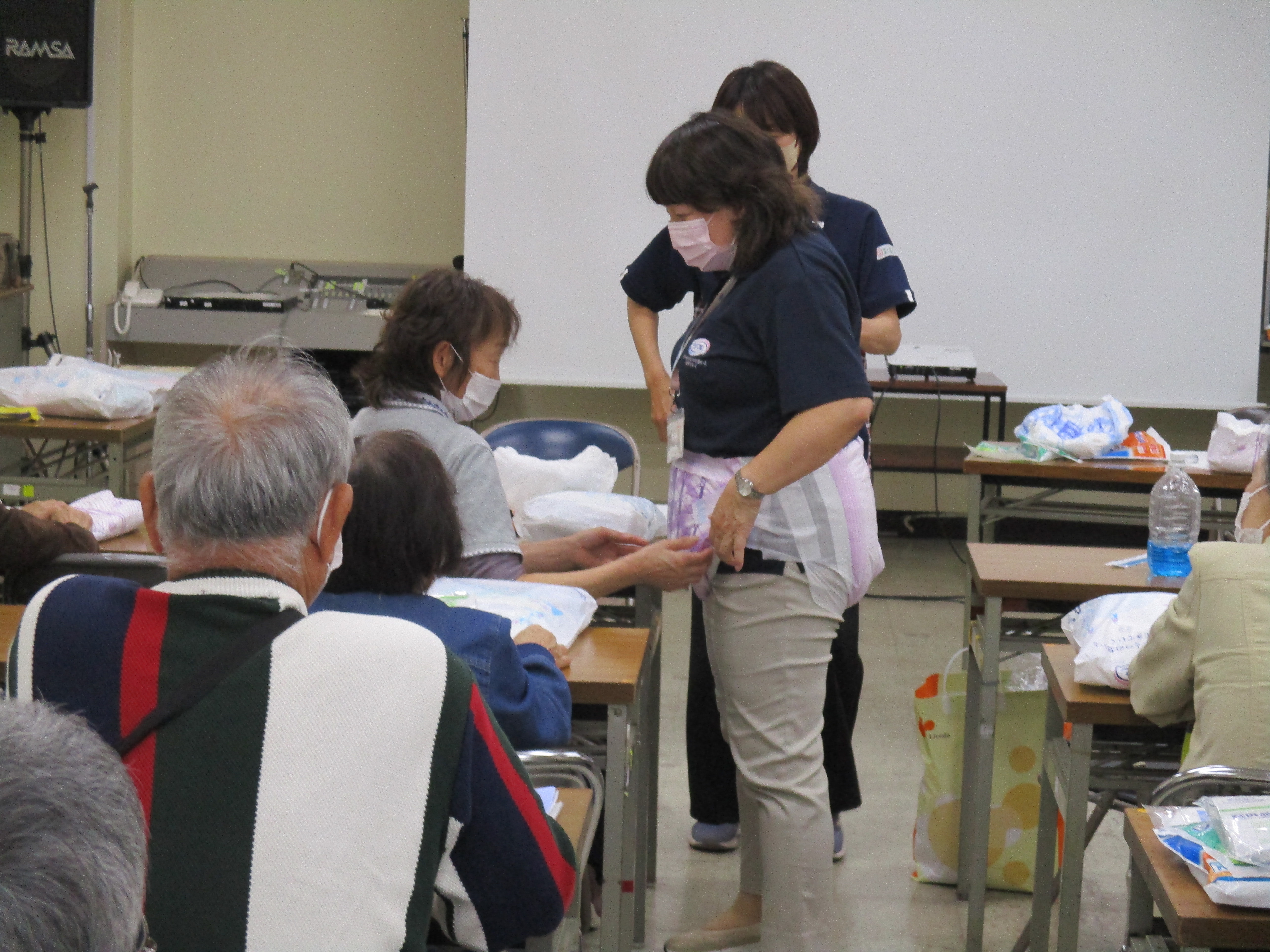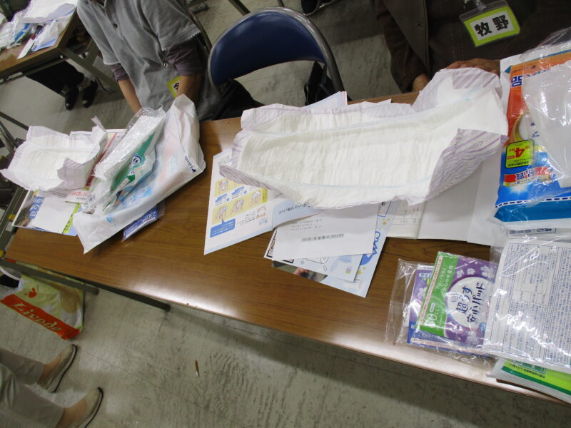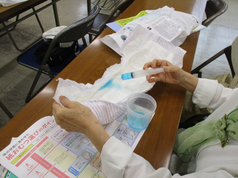 試供品を配布し、注射器を用いて実際に水を吸収させる実験を行い、漏れの原因とその対策について理解を深めました。 講師からは、「体型でおむつのサイズを選ぶのではなく、吸収力や装置位置、姿勢や時間帯などを考慮することが大切」との説明がありました。