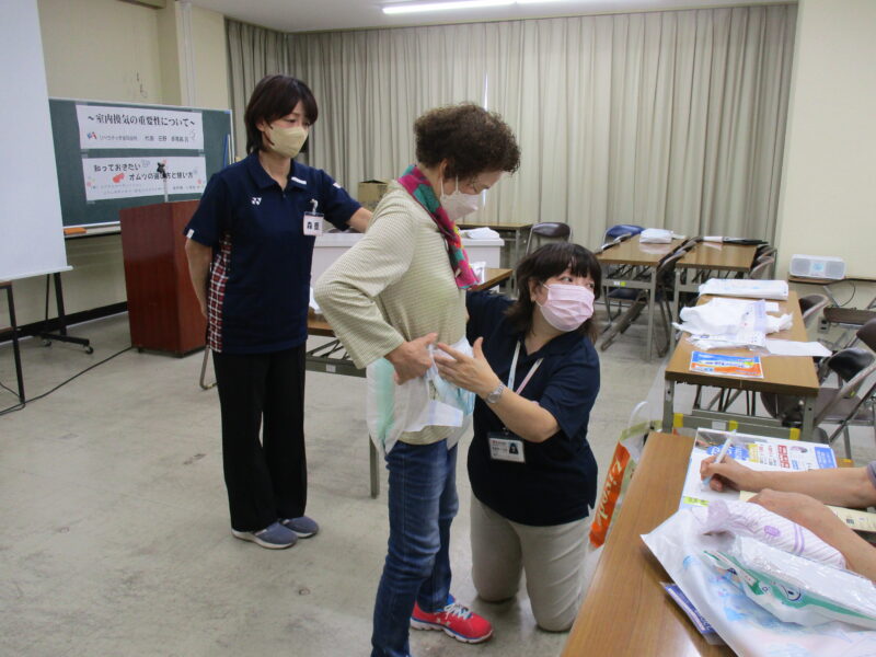 実際に講師自身がオムツを装着しながら、正しいつけ方とポイントをわかりやすく解説してくださいました。希望者には実際に装着体験をしてもらい、いつものつけ方とポイントを抑えた後のつけ心地を比較しながら感想を共有しました。