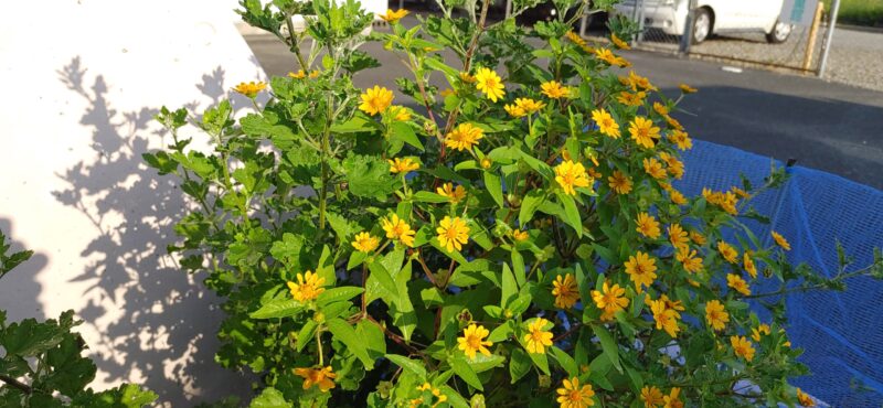 この夏の間、ずっとメランポジウムが花盛りでした。夏に咲いていたものは枯れてきましたが、また新たに生えてきてきました。しかも、葉が大きめです。