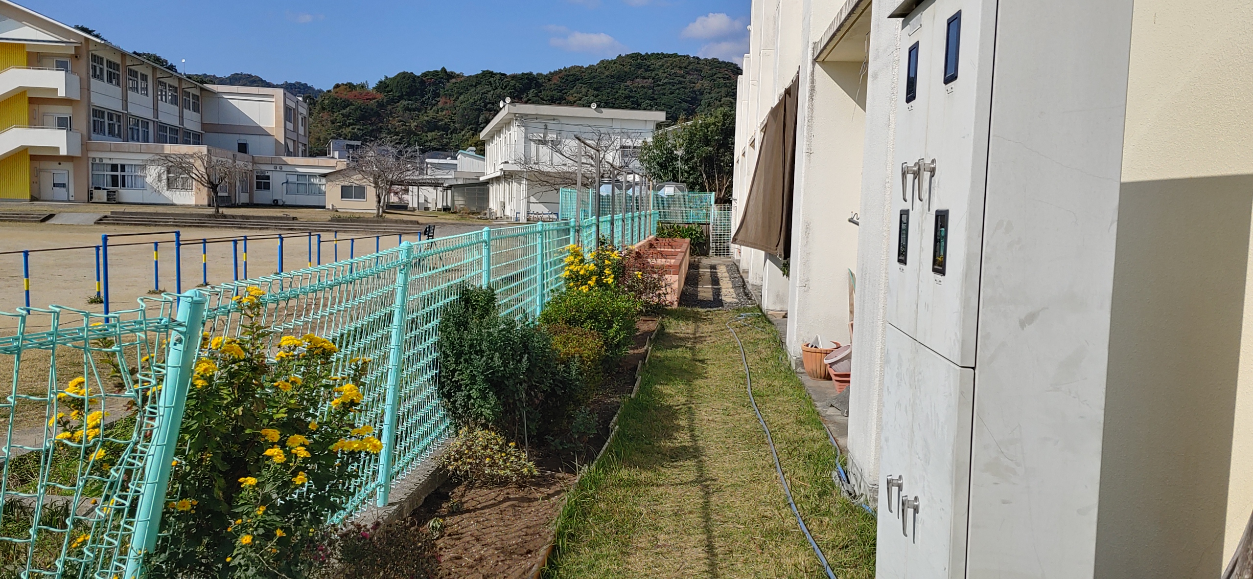 隣は旭小学校、日当たり良好です。2階は旭児童館です(別法人の経営)